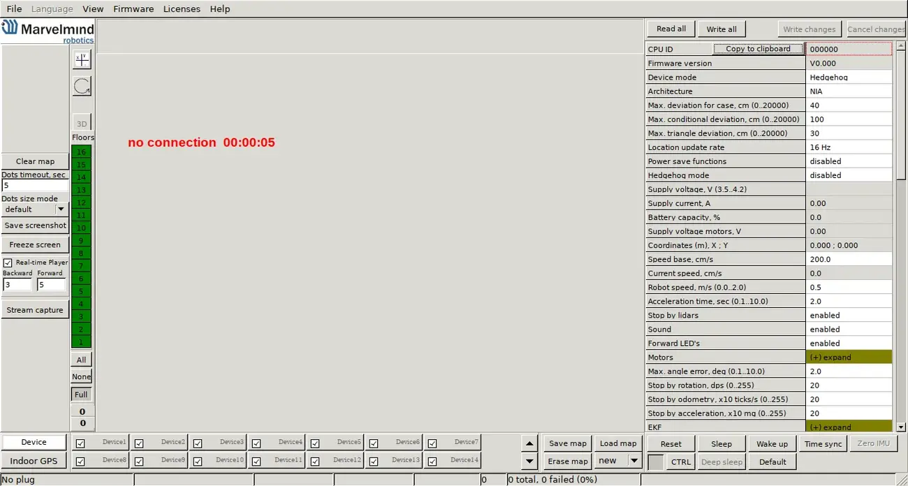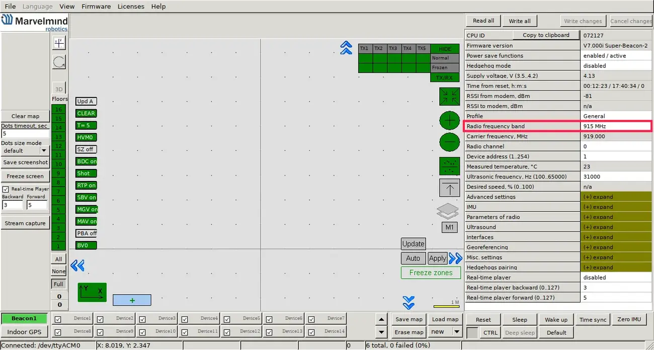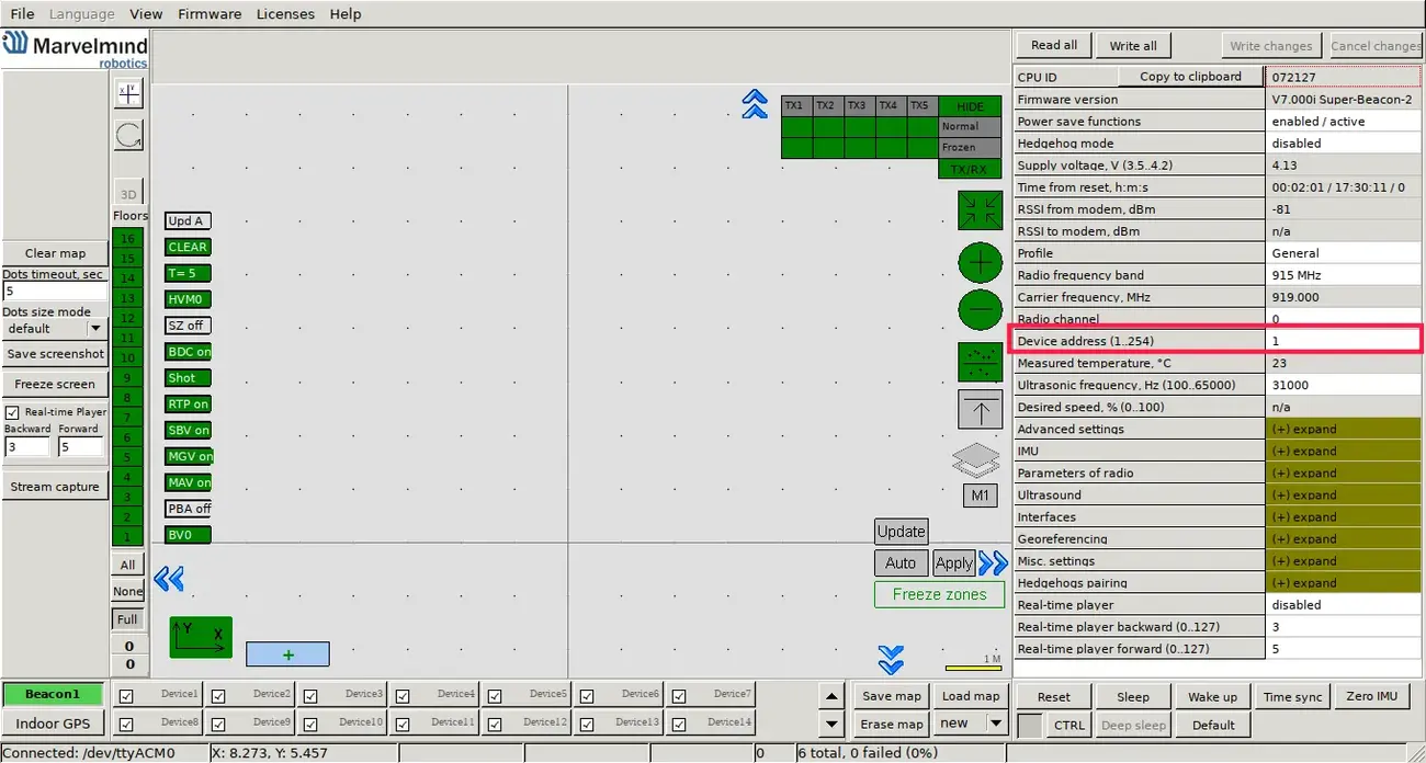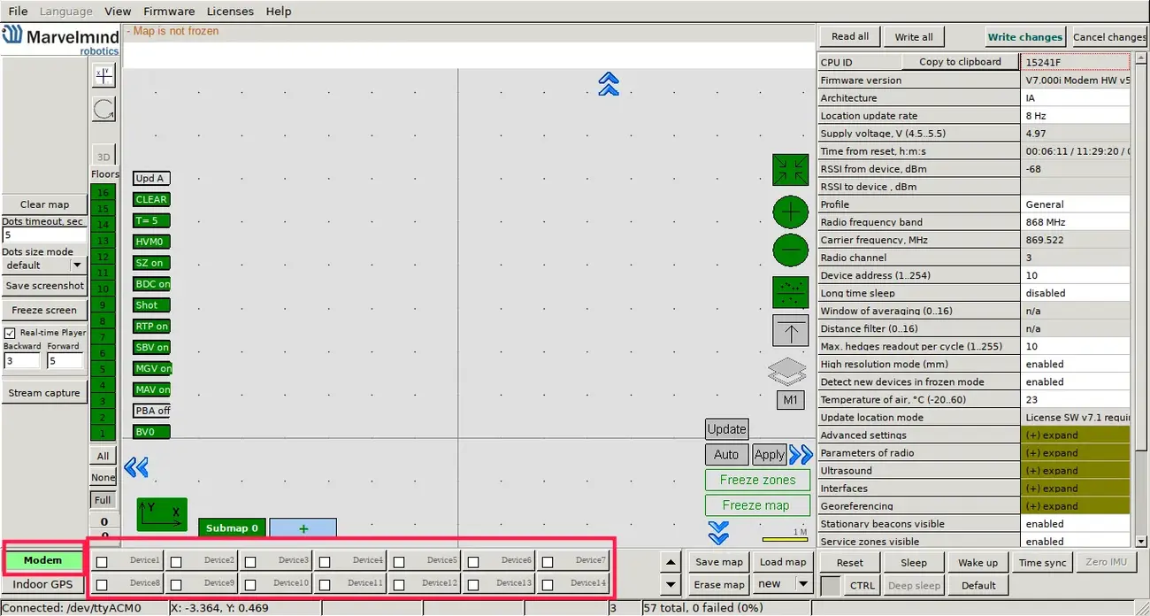 If you have turned off the dashboard, turn it on and connect the modem to your computer. Turn on all the stationary beacons. Now, you need to wake them up. In the dashboard, with the connected modem (in the lower left corner, the modem should be shown as connected), in the lower part of the dashboard, there are numbers of devices. Double click on a number to wake up a device with a given number.