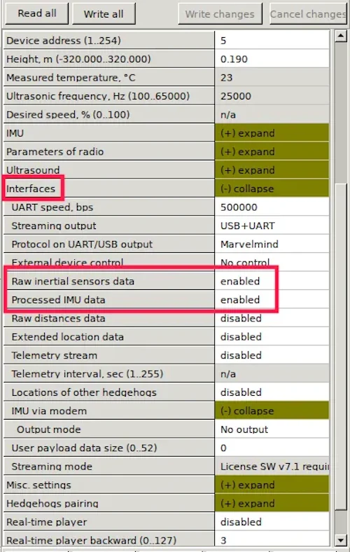 Only for the mobile beacon: in Interfaces section enable Processed IMU data and Raw internal sensors data.