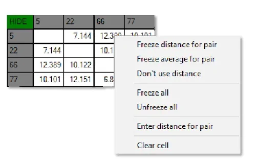 You can also input the distance between beacons manually. To do so, just right-click on a cell that corresponds to a given pair of beacons, then, choose Enter distance for pair. After that, you can also freeze the distance for that pair (or you can later freeze the whole submap at once).