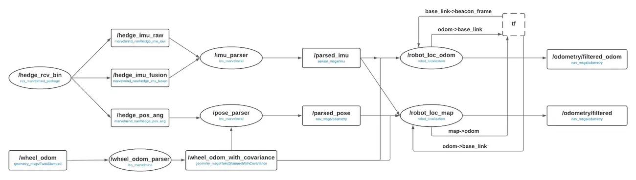 • pose_parser which takes the pose from marvelmind system, adds to the position wheel odometry with covariance, and publishes it as Odometry msg.