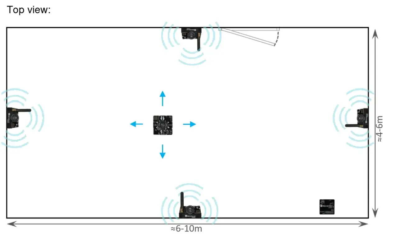 Place the stationary beacons high on the walls vertically in a way that will provide optimal ultrasonic coverage (make sure that the antenna is in the upper right corner of the beacons).